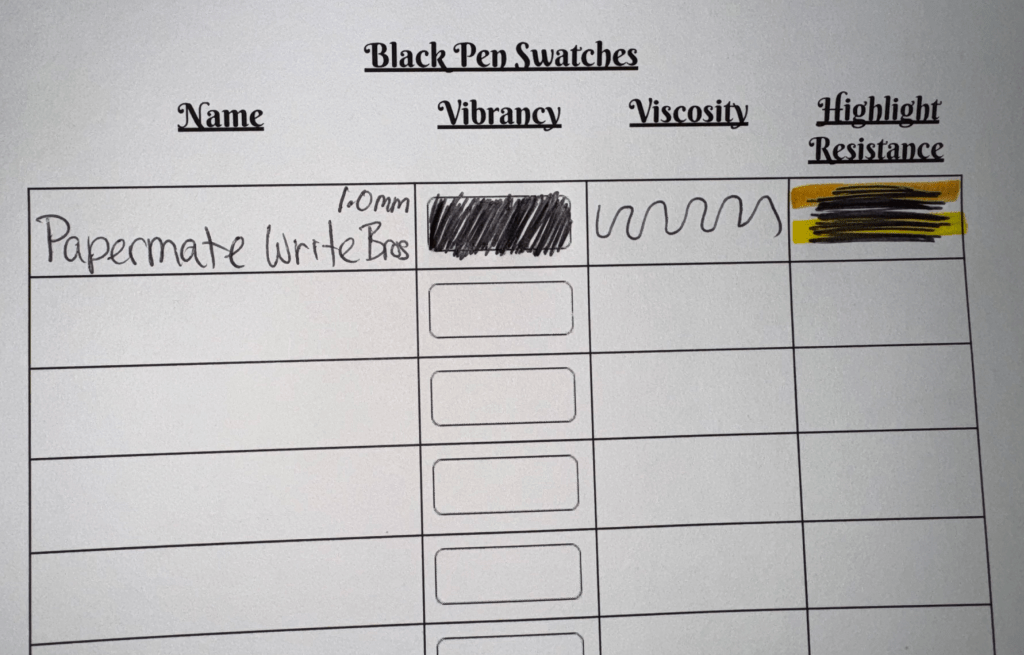 Outside of basic information like the pen name and point size, I look for Viscosity, Vibrancy, and Highlighter resistance. Every time I spotlight a pen I keep these things in mind. Here is a summary of those three qualities.
