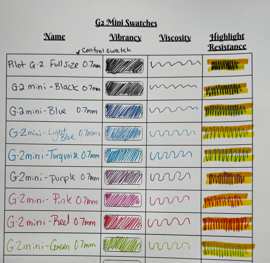 Vibrancy, Viscosity, and Highlighter resistance is the same between the G2 and the Mini. They do indeed use the same ink. Not surprising, but I still needed to check.