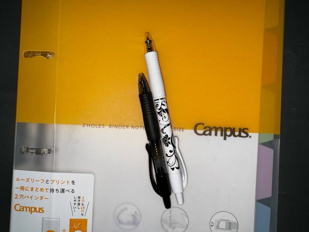 Let’s first compare these little guys with a standard G2 Pen from Pilot. Shout out to Kokyuo for making the Yellow campus 2-ring binder such a pleasing backdrop.